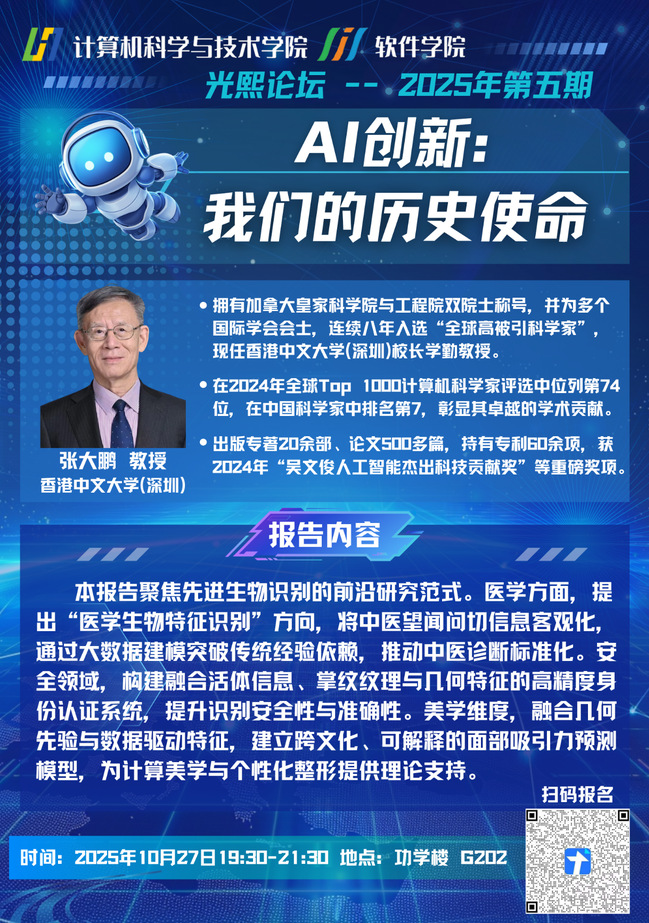 加拿大皇家科學院、加拿大工程院雙院士。IAPR/AAIA Fellow、IEEE Life Fellow。連續(xù)八年被評選為全球高被引科學家,在國際計算機2024年Top 1000名計算機科學家評選中,以D-Index=130排名74,中國第7。現任香港中文大學(深圳)數據科學學院和人工智能學院雙聘校長學勤教授,廣東省體表泛化感知與模式分析工程技術研究中心主任、深圳市模式分析與感知計算重點實驗室主任。從事人工智能和生物識別相關研究40余年。已出版20余部學術專著、500余篇高水平論文和60余項美國/日本/中國專利。張大鵬教授是掌紋識別、中醫(yī)四診量化及人臉美學客觀化等研究領域的開創(chuàng)者和領軍人,曾獲2024年度吳文俊人工智能杰出科技貢獻獎、我國香港特區(qū)的最高科技獎 “裘槎優(yōu)秀科研者”等。